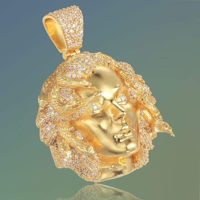 Iced Out Medusa Pendant in 18K Gold both comfort and luxury. Let you become a bright spot in the crowd. The Pendant is a nice handcrafted piece & makes a perfect piece to wear by itself. High Quality and polished.