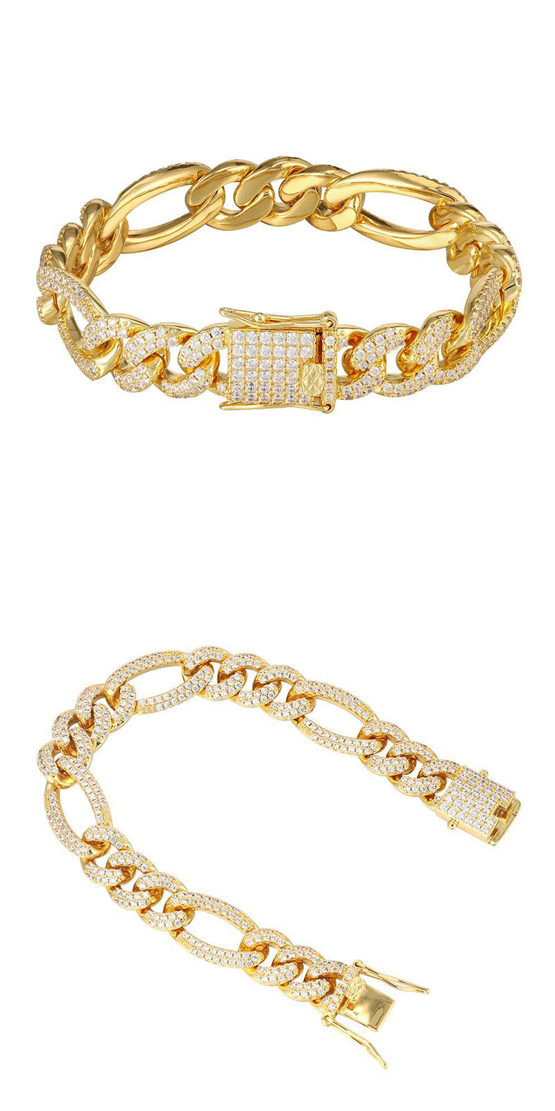 Iced Out Figaro Bracelet in 18K Gold both comfort and luxury. Let you become a bright spot in the crowd. The bracelet is a nice handcrafted piece & makes a perfect piece to wear by itself. High Quality and polished.
