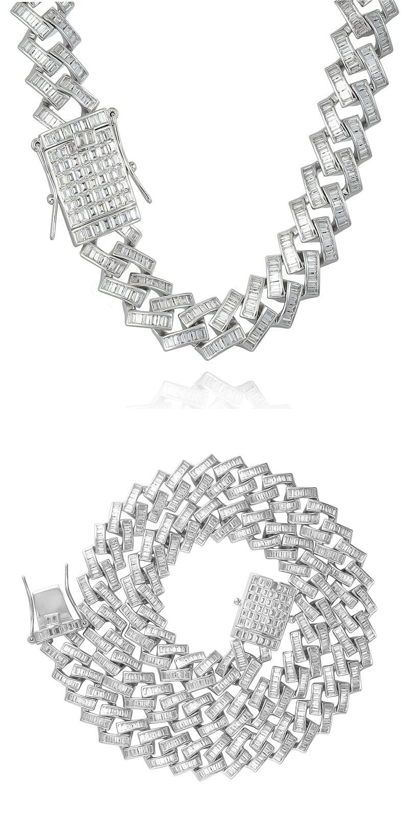 Iced Out Baguette Cuban Link Chain Necklace in White Gold both comfort and luxury. Let you become a bright spot in the crowd. The necklace is a nice handcrafted piece & makes a perfect piece to wear by itself. High Quality and polished.